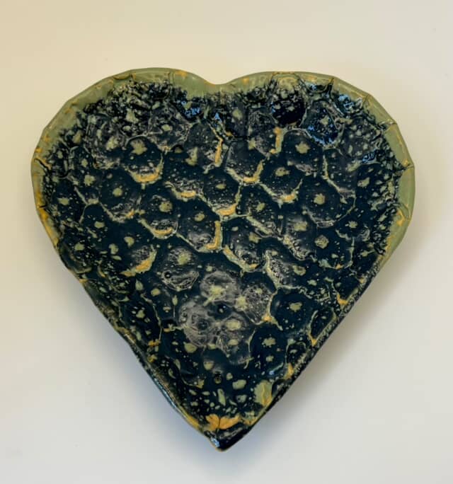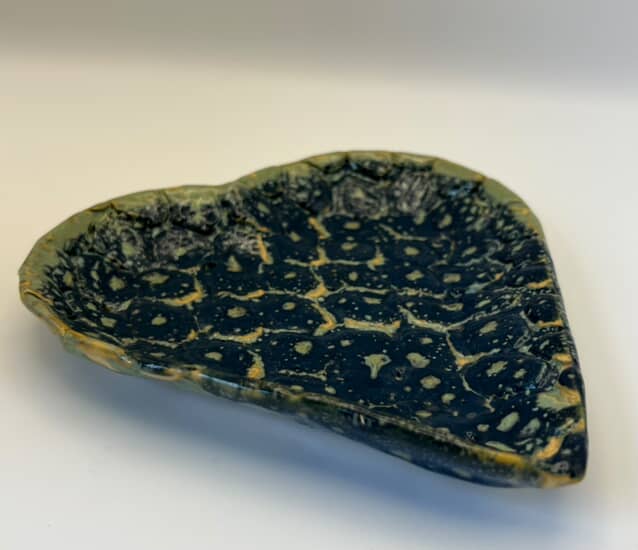 A dark, heart-shaped dish glazed in rich indigo and green, speckled with sandy flecks.