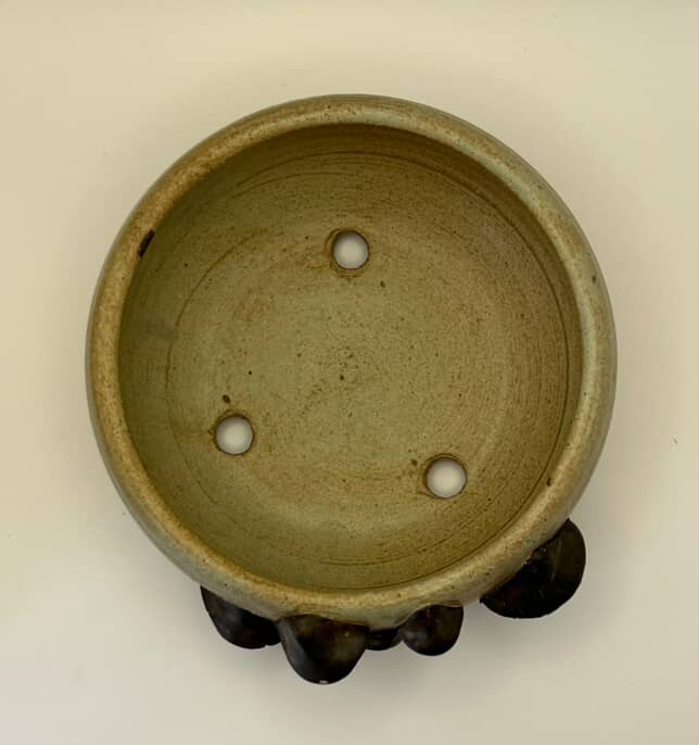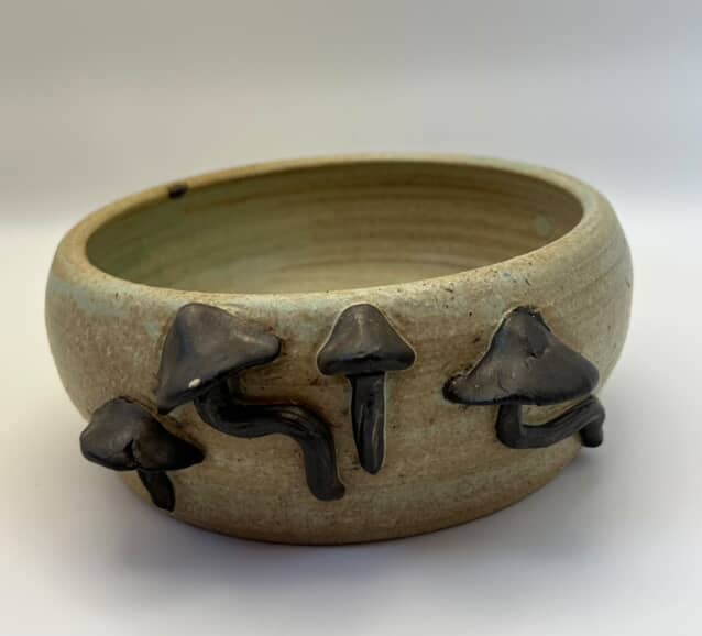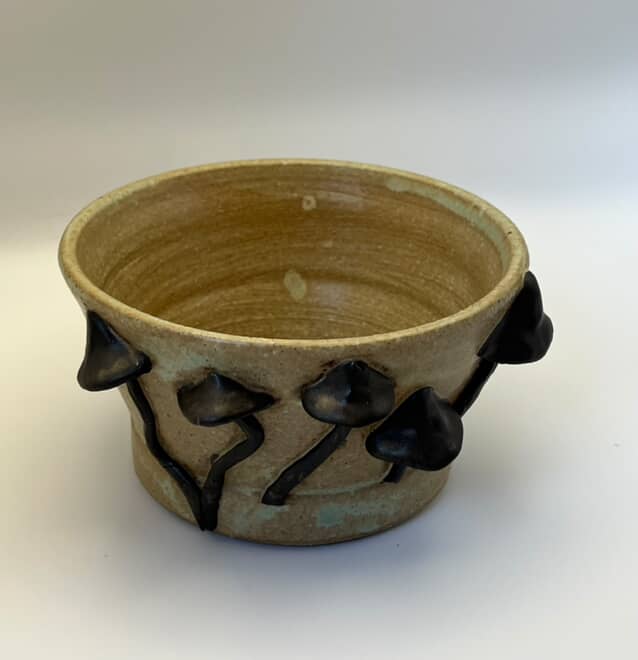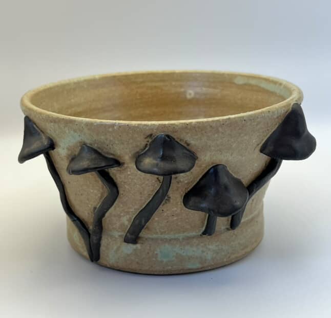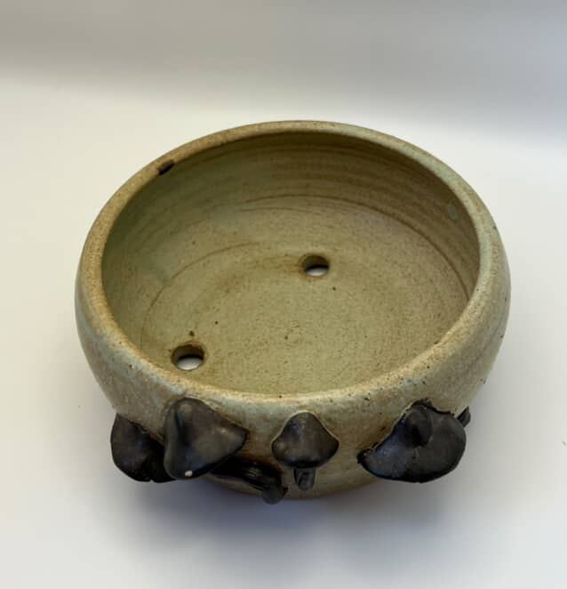 Earthy stoneware plant pot with sculpted black mushrooms dancing around its surface. Mushroom design may vary.
