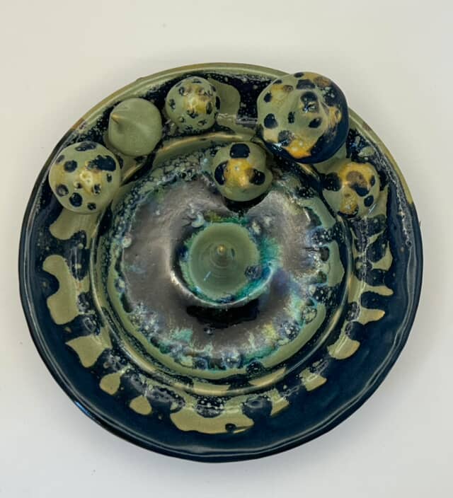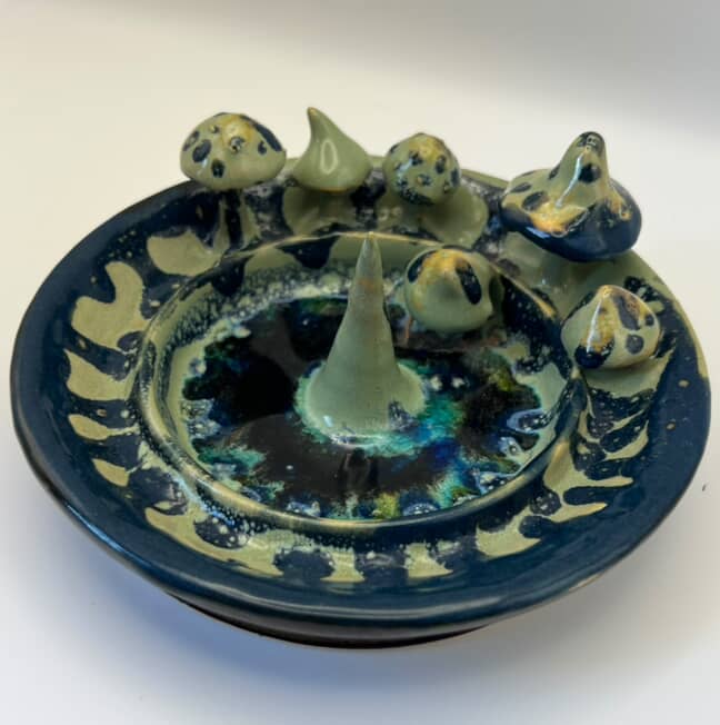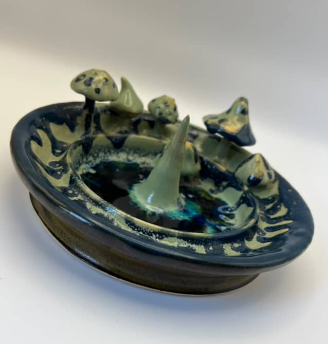 A deep, glossy ashtray or jewelry dish, adorned with whimsical mushrooms, its surface shimmering in shades of moss green and midnight blue.