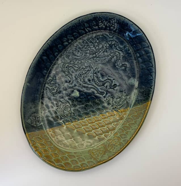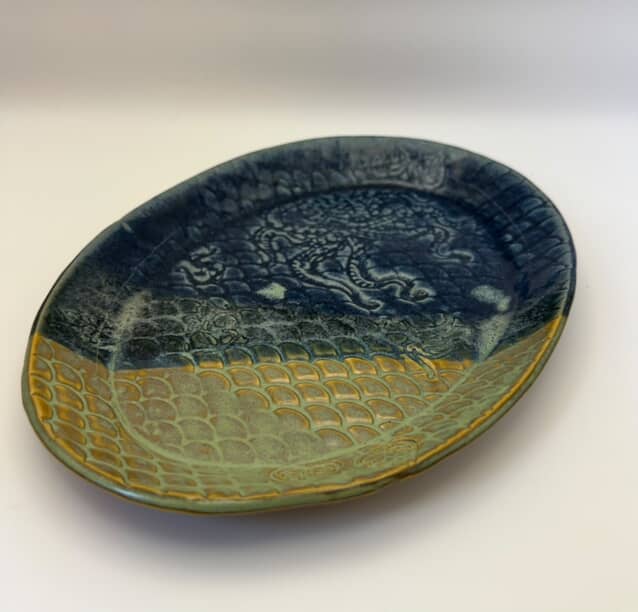 An oval platter with scales and a hidden octopus, blending midnight blue with golden sandy green.