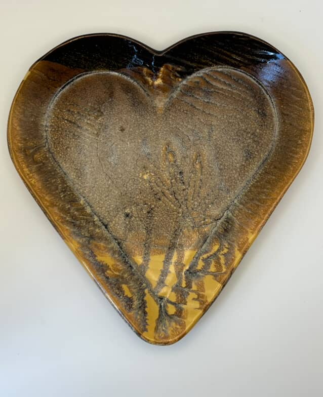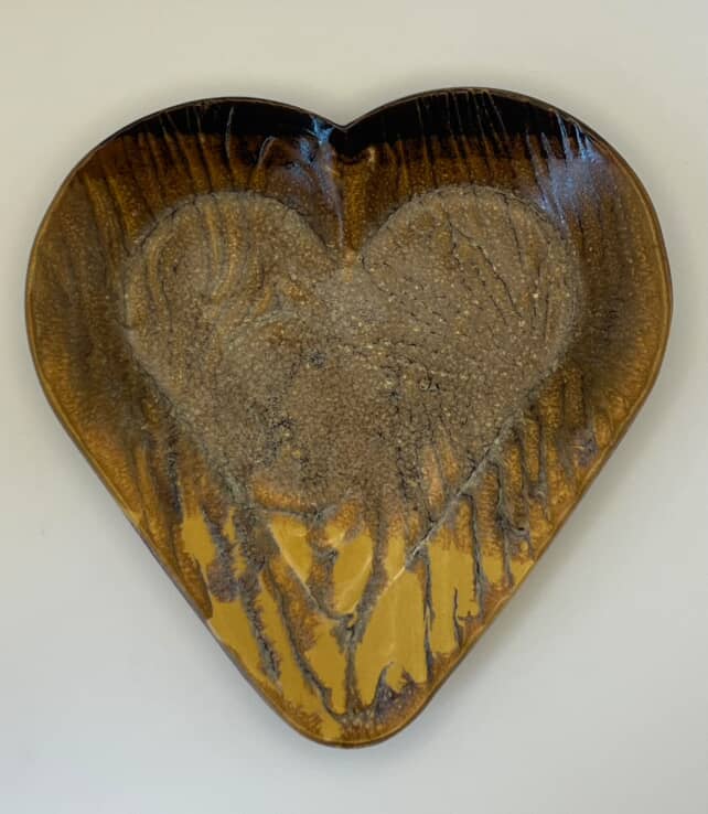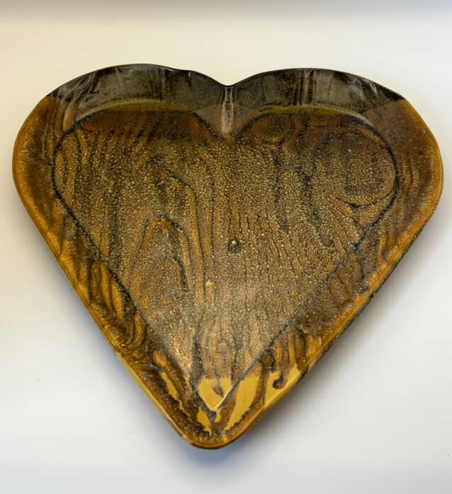 A set of 3 heart-shaped plates in warm amber and golden hues, its textured surface reminiscent of woodgrain and natural earth. Each plate shows unique patterns, all three plates included.